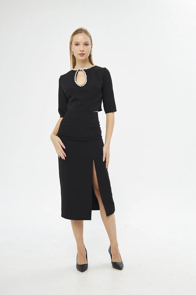 Baisse Siyah Yaka Taş İşlemeli Kısa Kollu Bluz-Yırtmaçlı Midi Etek Kadın Takım