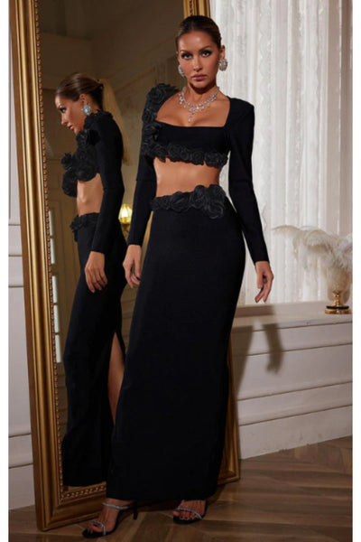 Cleopatra Siyah Çiçek Aplikli Vücuda Oturan Crop-Etek Takım