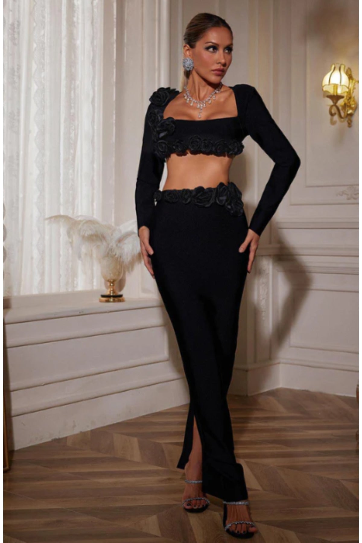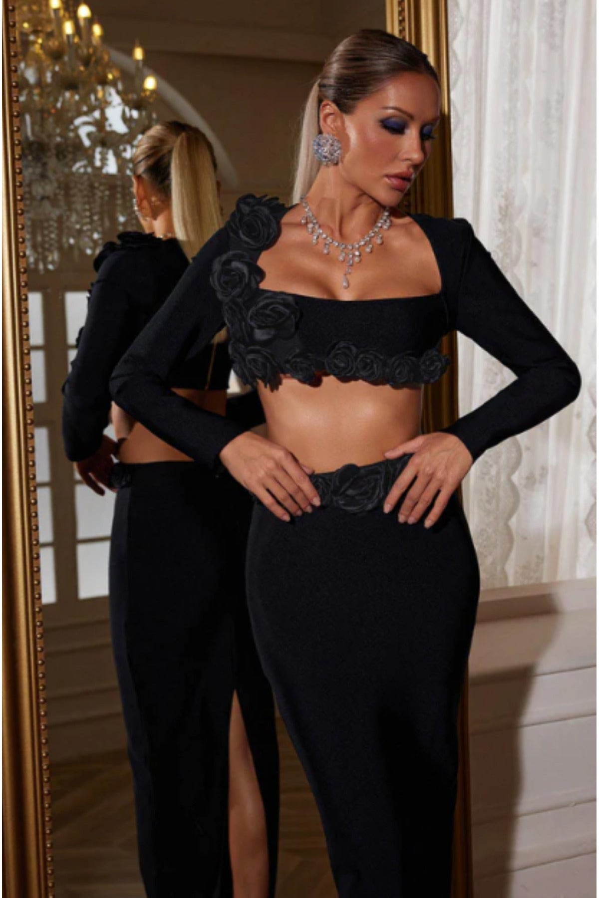 Cleopatra Siyah Çiçek Aplikli Vücuda Oturan Crop-Etek Takım