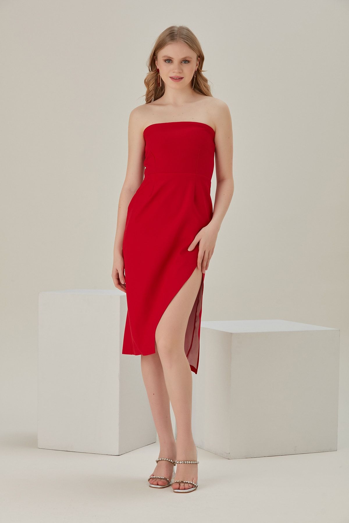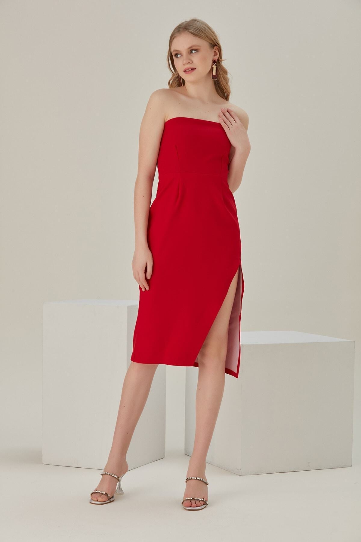 • Zarif tasarımıyla dikkat çeken straplez yaka, omuzları serbest bırakarak feminen bir görünüm sunar