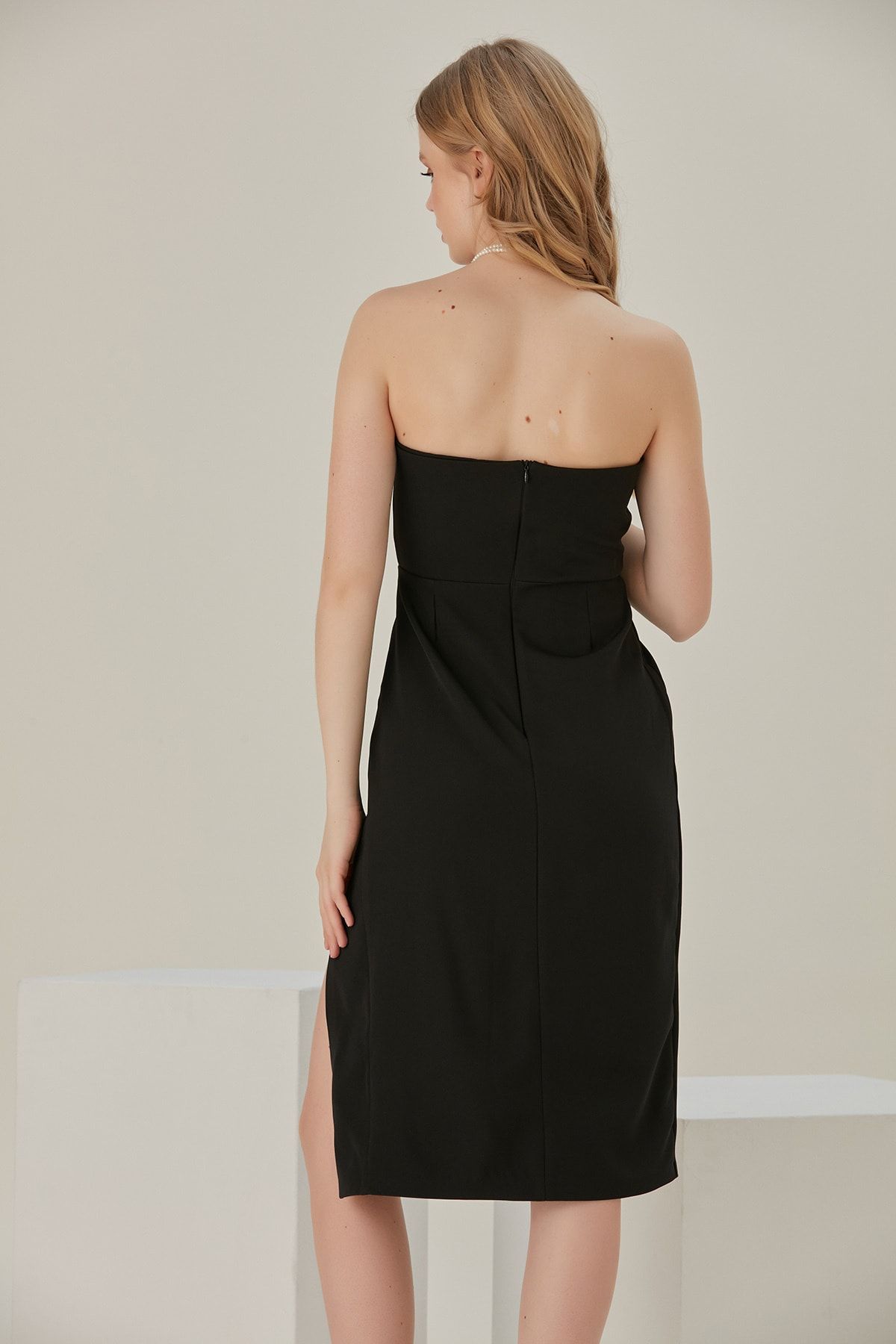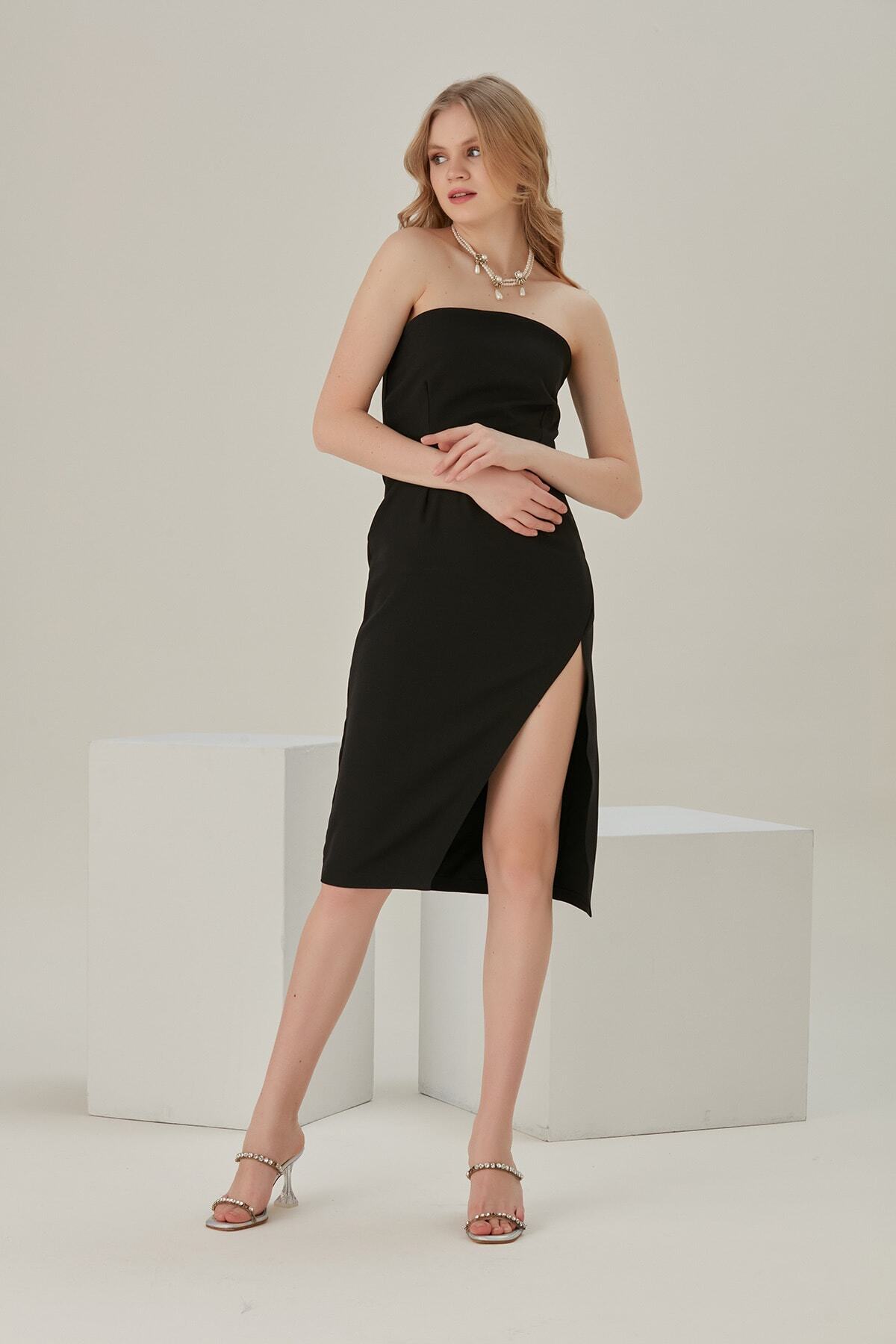 Le Lys Siyah Staplez Yaka Açık Yırtmaçlı Kadın Elbise