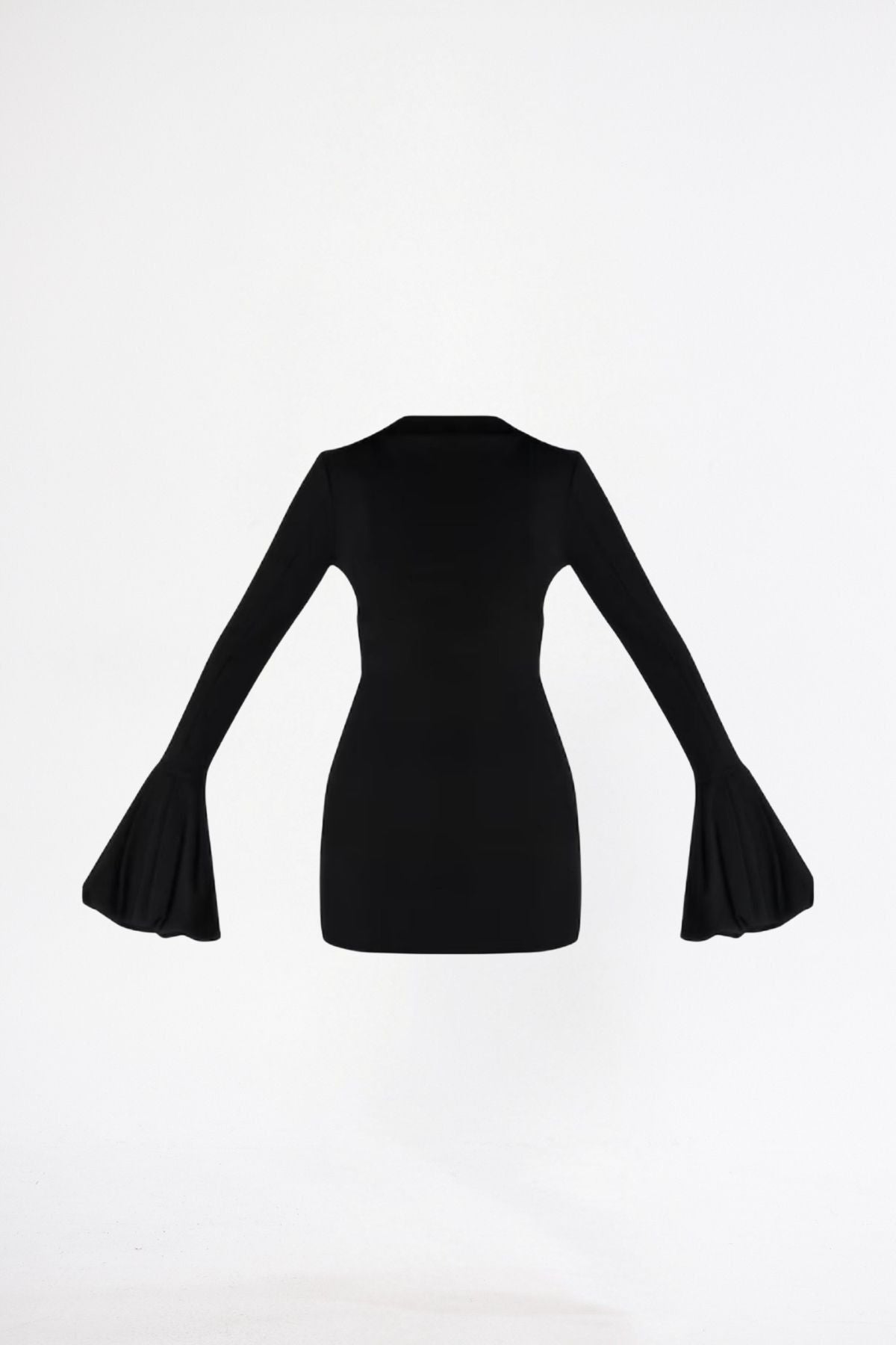• Size siyah tonlarında kumaştan, yüksek yakalı tasarım ve kabarık kollu detayla sunulan bu dar elbise sizi çağırıyor