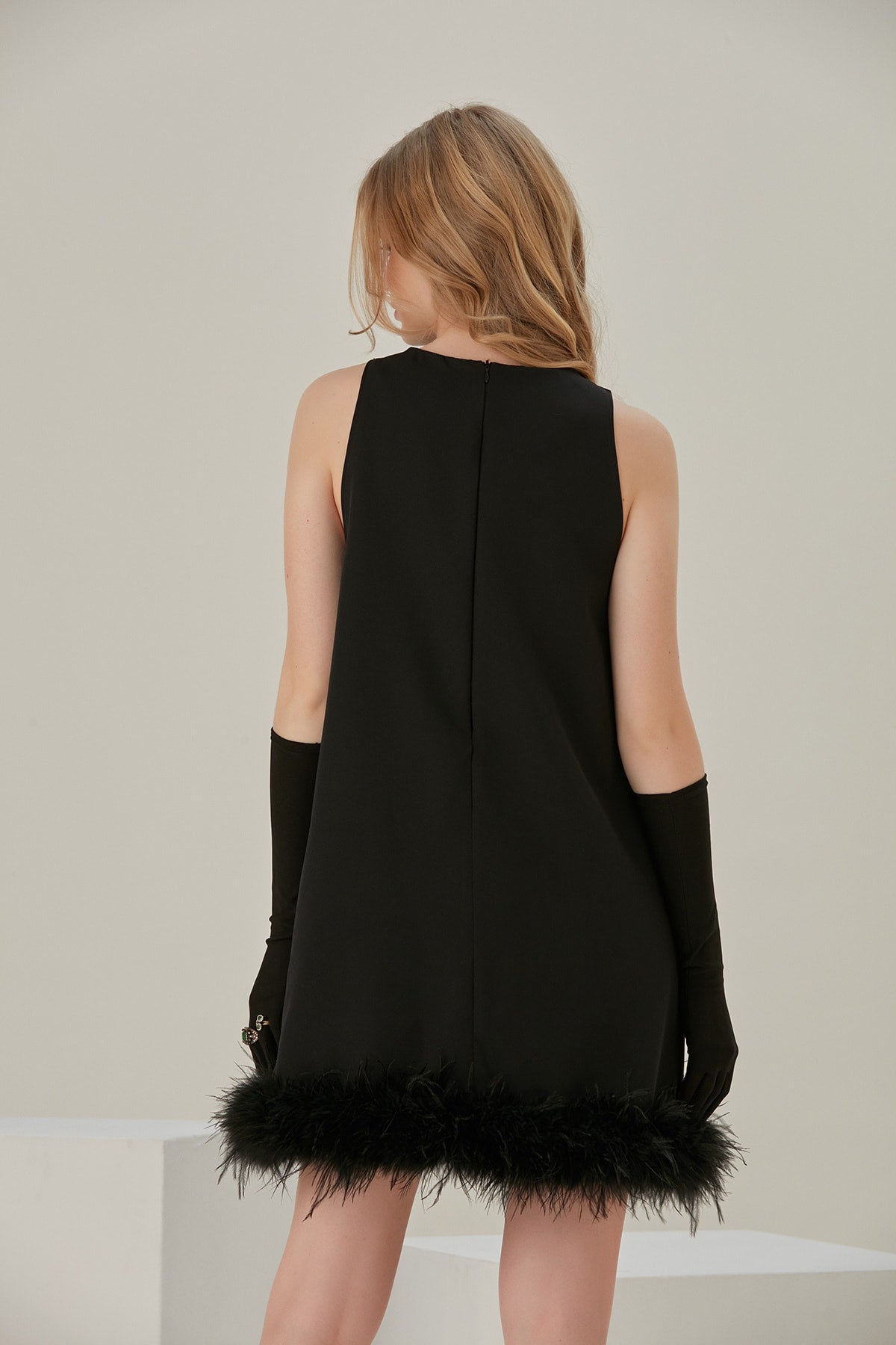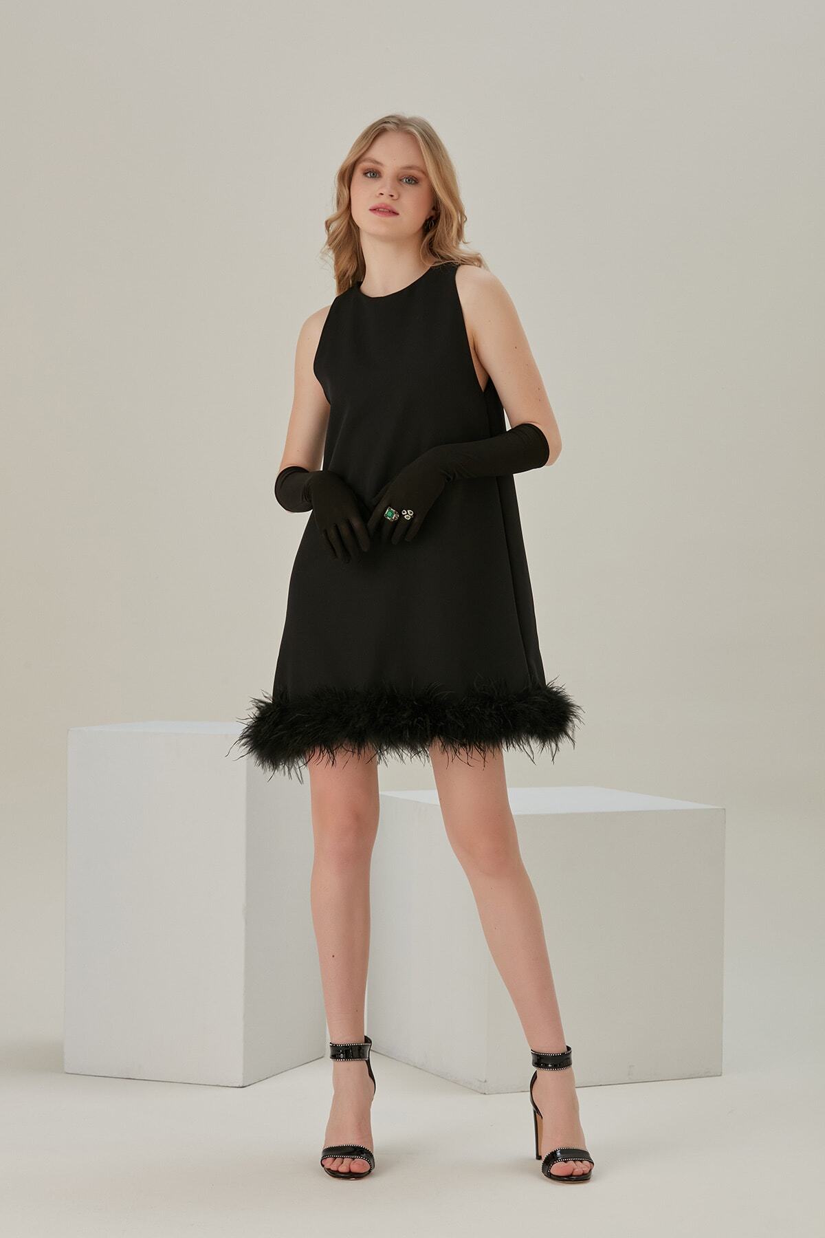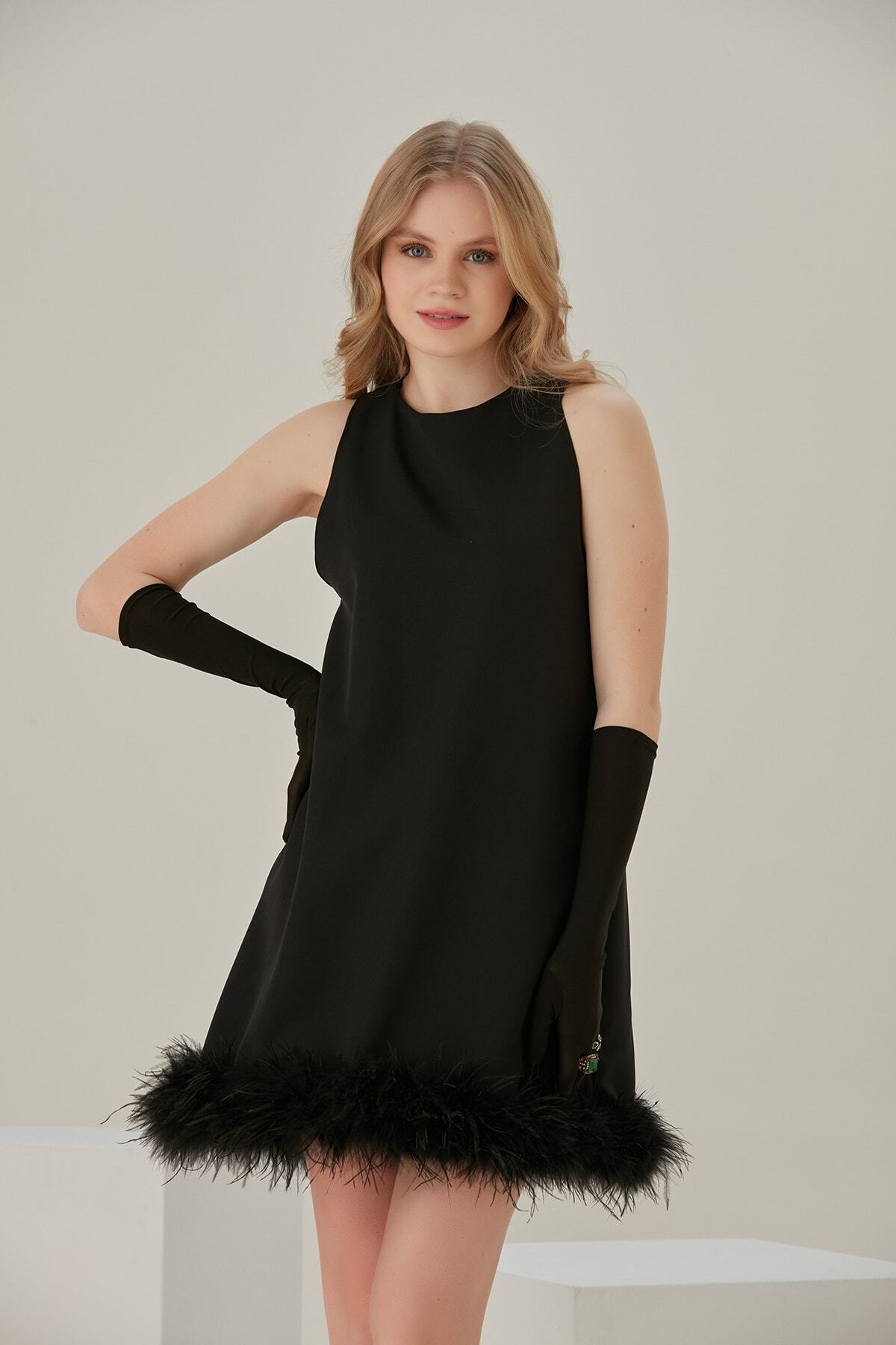 Marguerite Siyah Kloş Etek Ucu Tüylü Halter Yaka Kadın Elbise